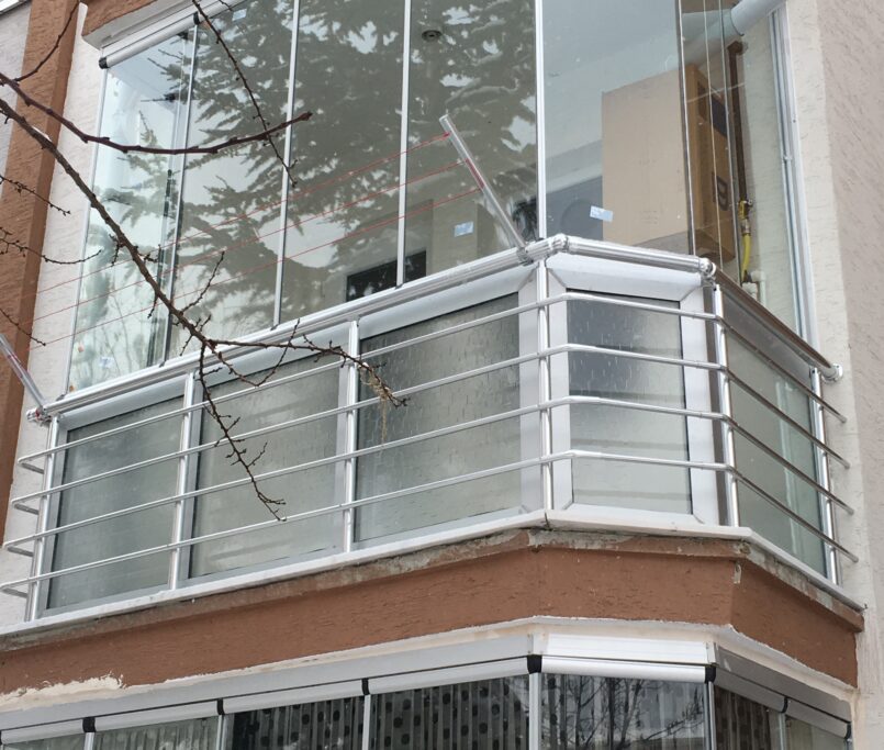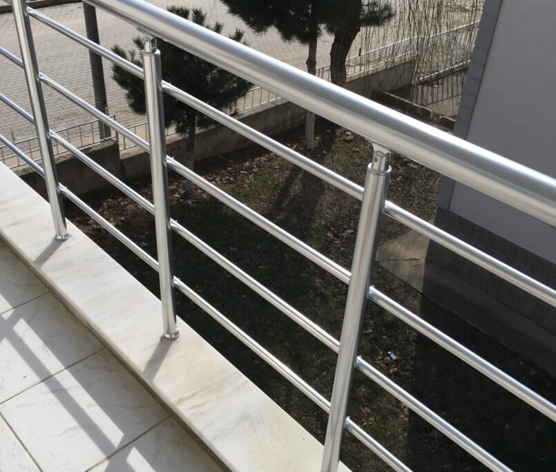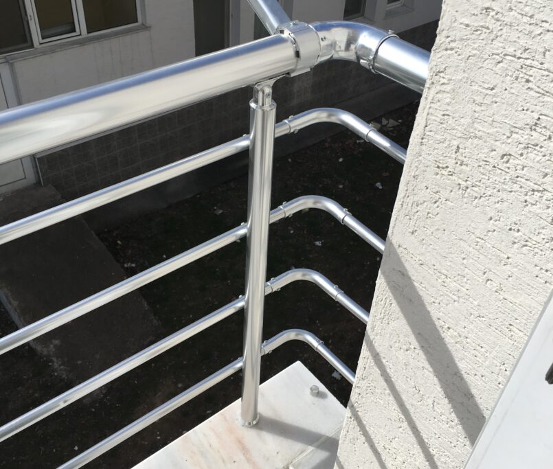 Alüminyum küpeşte ve korkuluk, dikme denilen dikey parçalardan ve bu dikey parçaların üstünden geçen üst borudan ve ortasından geçen iki veya üç sıralı yatay borulardan oluşur.